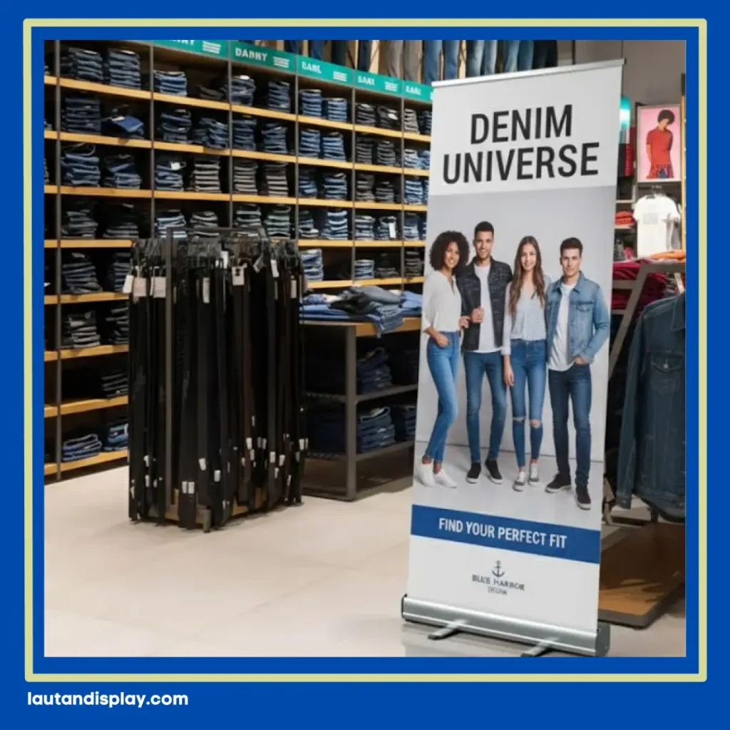 Pastikan juga banner tidak terhalang rak, pintu, atau dekorasi lainnya. Gunakan stand banner yang kokoh agar tampilan tetap profesional, rapi, dan tidak mudah bergeser.
