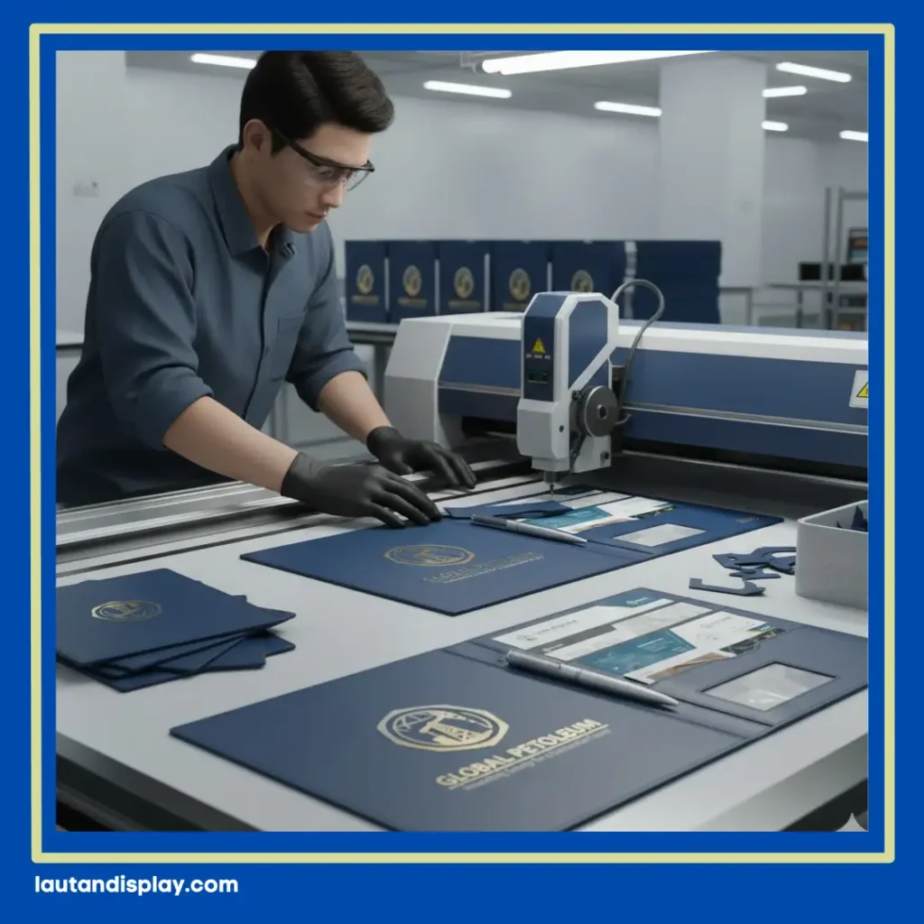 • Poly (Hot Stamping) dan Emboss: Jika anda ingin logo perusahaan berwarna emas atau perak yang mengkilap dan terasa timbul saat diraba, teknik ini adalah kuncinya. Meskipun menambah biaya karena memerlukan pembuatan matras tembaga, hasilnya sangat efektif dalam membangun citra premium.