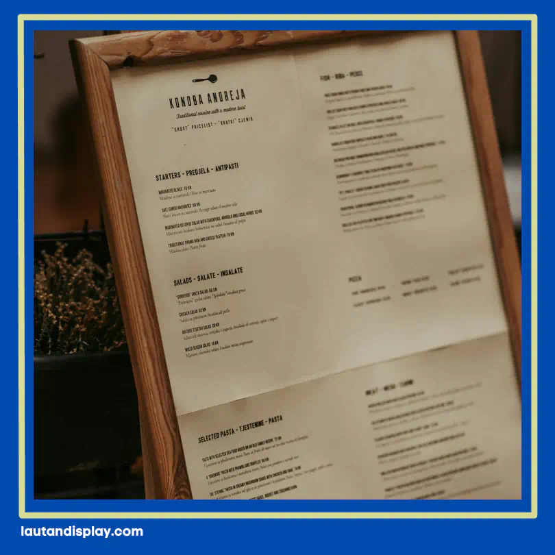 Selain itu, menu juga berfungsi sebagai alat marketing. Lewat penyusunan layout, kamu bisa menonjolkan menu signature, seasonal dish, bundling, atau promo dengan strategi visual yang tepat. Intinya, menu bukan hanya informasi menu adalah taktik marketing.