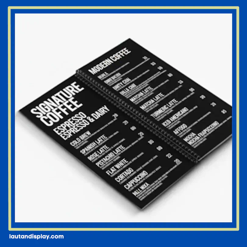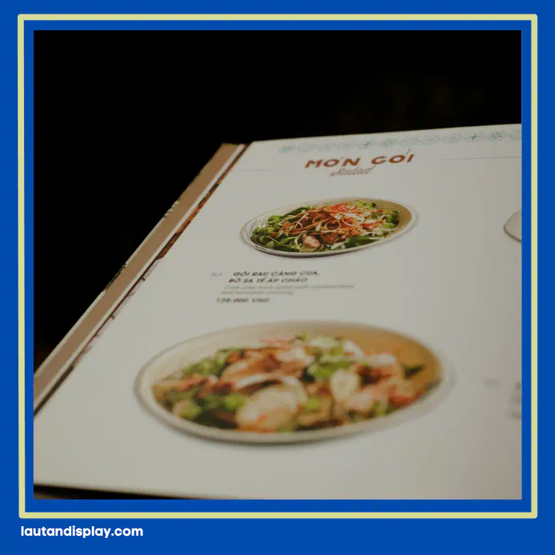 Siap upgrade branding restoranmu dengan buku menu yang premium dan estetik? Cetak buku menu restoran di Lautan Display dan dapatkan kualitas profesional dengan berbagai pilihan material, finishing, dan custom printing sesuai identitas brandmu.
