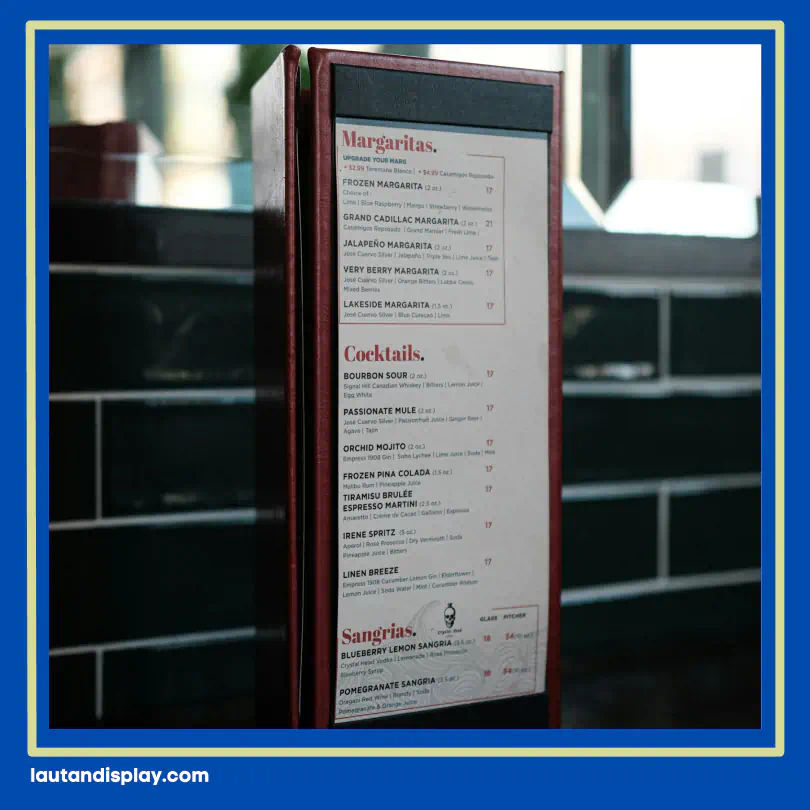 Material bukan hanya soal estetika, tetapi juga soal durability. Restoran dengan traffic tinggi sebaiknya memilih material yang mudah dibersihkan agar buku menu tetap terlihat seperti baru.