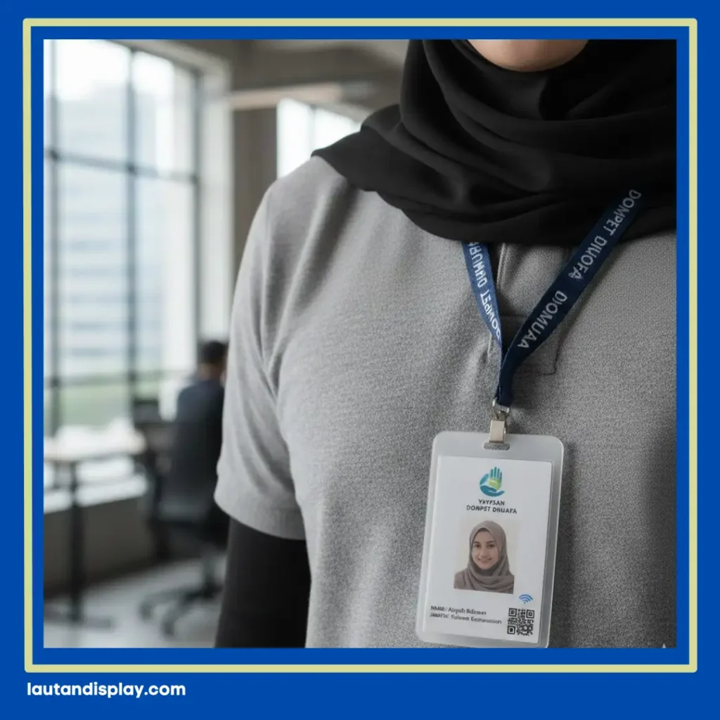 Jangan lupakan aksesoris seperti tali gantungan (lanyard) dan tempat kartu (card holder). Menggunakan lanyard dengan sablon logo yayasan akan meningkatkan visibilitas merek anda secara signifikan saat relawan berada di keramaian.