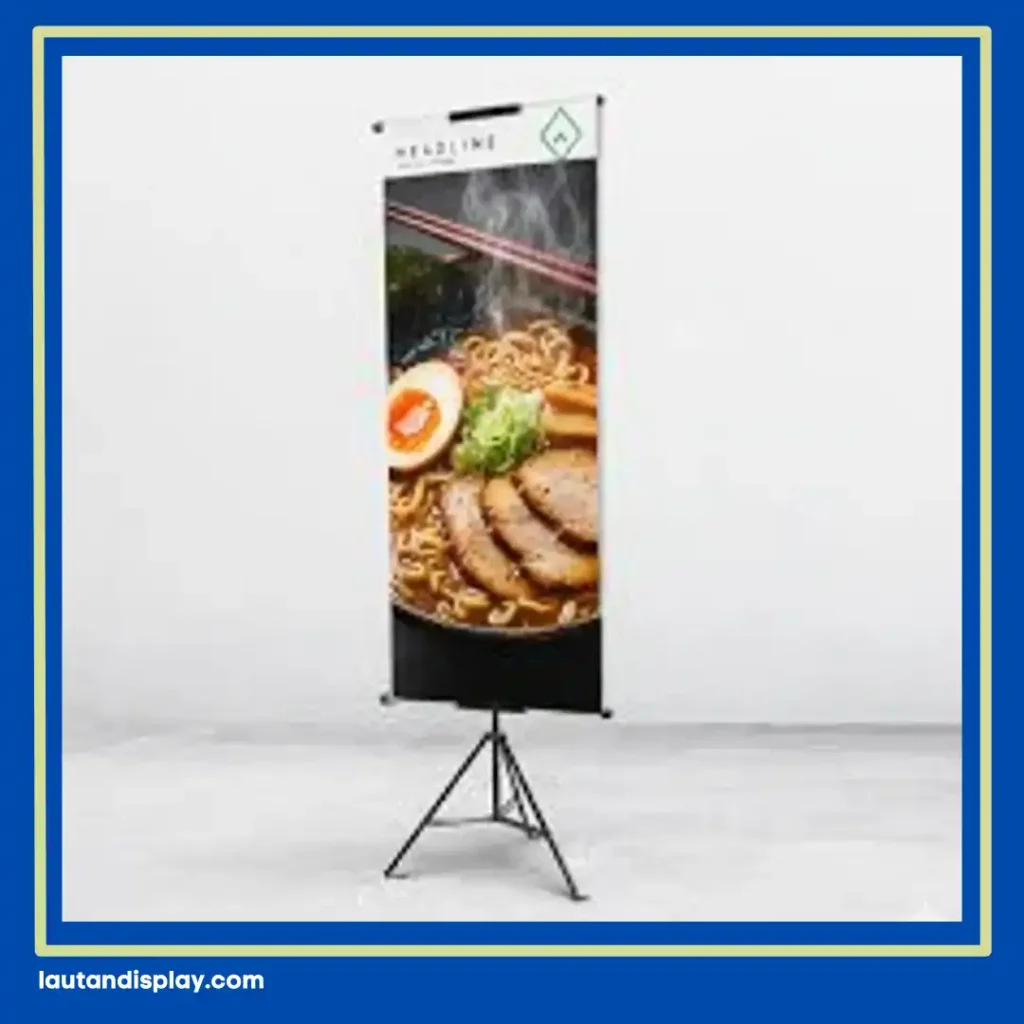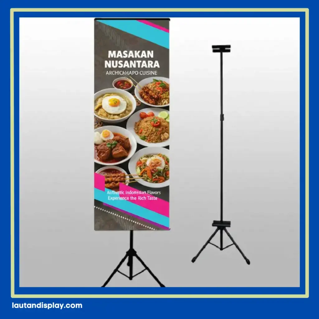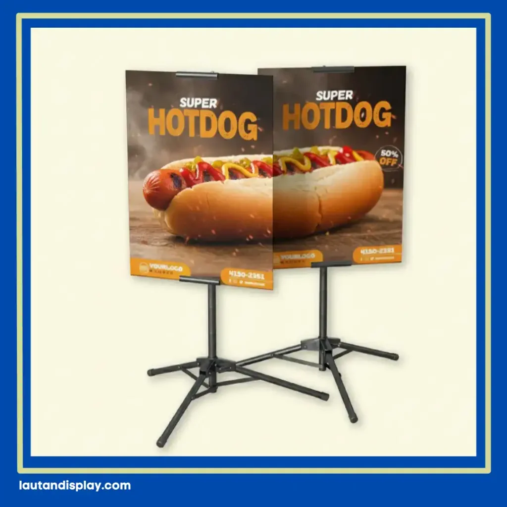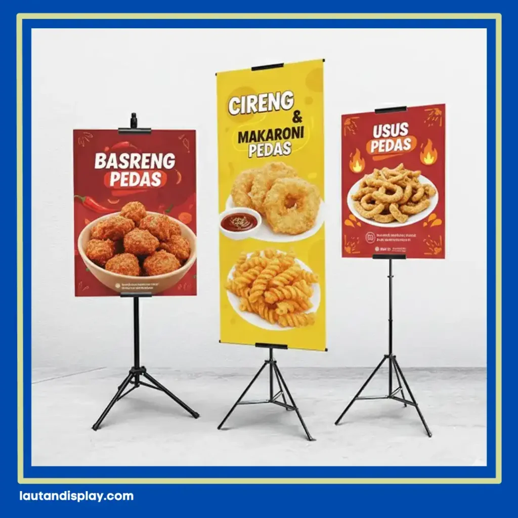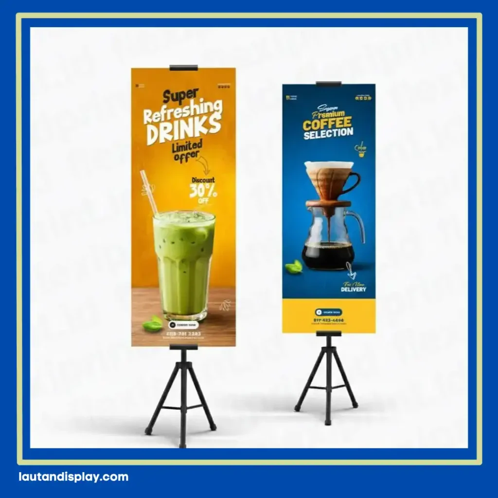 Pelaku bisnis F&B kerap memilih tripod banner karena satu rangka bisa menampilkan materi promosi pada dua sisi berlawanan, membuat informasi terlihat jelas dari arah mana pun pengunjung datang. Hal ini memberikan efisiensi dua kali lipat dibandingkan media promosi konvensional lainnya.