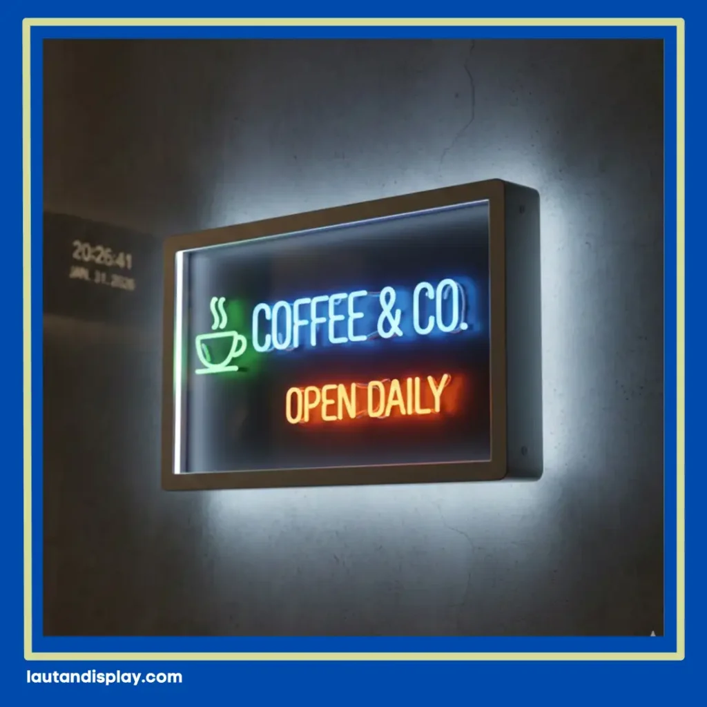- Neon Box Horizontal (Landscape): Ideal untuk dipasang di atas pintu masuk toko sebagai papan nama utama.