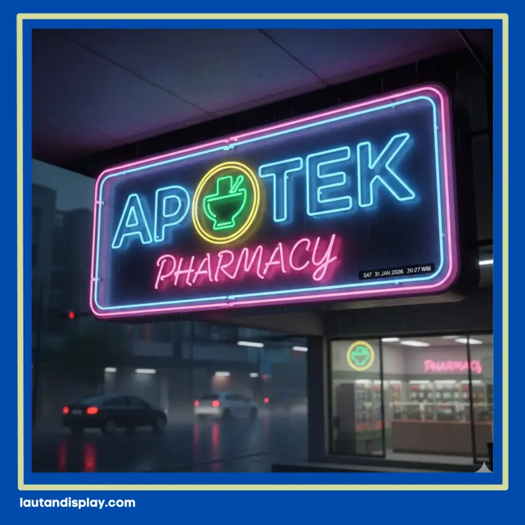 - Neon Box Dua Sisi (Double Sided): Sangat efektif jika dipasang menonjol keluar bangunan agar terlihat dari dua arah arus lalu lintas.